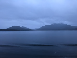 Wir wollen die Einfahrt in den Charles Darwin Channel bei Sonnenaufgang nicht verpassen. Mystische Stimmung an Deck. Es ist kalt geworden. Das Meer ist ruhig und Nebel umhüllt die Schärenlandschaft. Wir gleiten langsam durch den engen Kanal. Obwohl der Himmel nicht wirklich aufklart, genießen wir den Ausblick mit immer wechselnden Lichtverhältnissen.