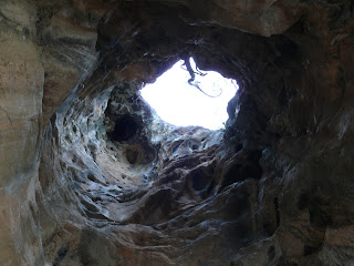 Es geht nun fast auf allen vieren durch einen nur 1m hohen Abschnitt – die Beine brennen, während wir den Stalaktiten über unseren Köpfen ausweichen. Über uns ein Loch – vier Meter gehts aufwärts. Nur mit Armkraft ziehen wir uns hoch, es ist zu eng zum Anwinkeln der Beine. Ich zuerst, sicher ist sicher, die Kräftigen hinter mir können denn ruhig steckenbleiben. Der letzte, unser Dickerchen, ist schweißgebadet, als er endlich – Stunden später – oben ankommt. Diese hohe Luftfeuchtigkeit und mangelnde Luftzufuhr verlangt von uns Höchstleistung!