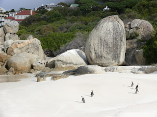 Indischer Ozean – es wird ruhiger. Kaum um die Ecke rum, schon ein ganz anderes Klima. Die Sonne lacht, die Stände locken. Dieser malerische Strand ist das Zuhause der Pinguine – Boulders Beach: