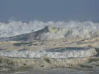 Riesige Wellen soweit das Auge reicht, die sich tosend und mit einer gewaltigen Geräuschkulisse schon weit draußen brechen.