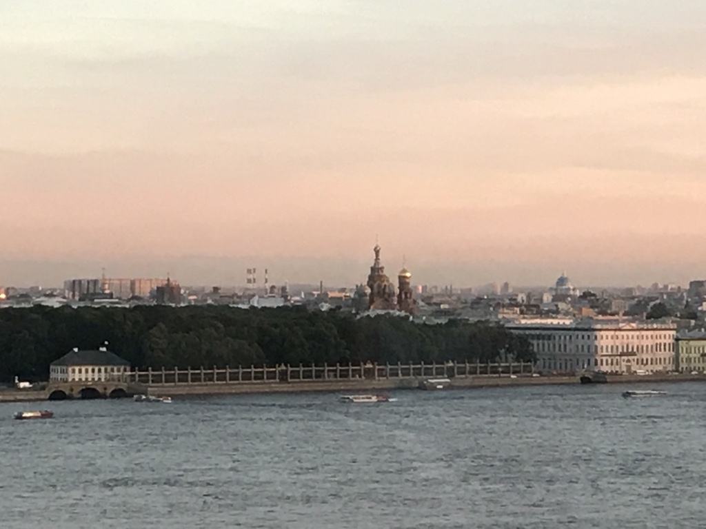 Am Abend werden wir zu unserer neuen Bleibe gefahren. Das Hotel St. Petersburg liegt an der Außen-Newa gegenüber des Schiffes Aurora, nicht unbedingt schön anzusehen mit den groß leuchtenden Kia Motors Lettern an der Plattenbau-Fassade, aber die Zimmer und der Ausblick sind überwältigend. St. Petersburg liegt uns zu Füßen von unserem Panoramafenster aus.