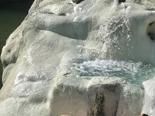 Schon von Weitem hatten wir den Geruch von Schwefel wie faule Eier in der Nase. Man gewöhnt sich an alles! Nach kurzer Zeit riechen wir es nicht mehr. Genießen das warme sprudelnde Wasser. Zur Abkühlung springen wir ab und zu in den Fluss. Wie schön! Und der Hund chillt dabei