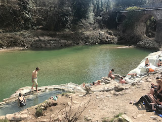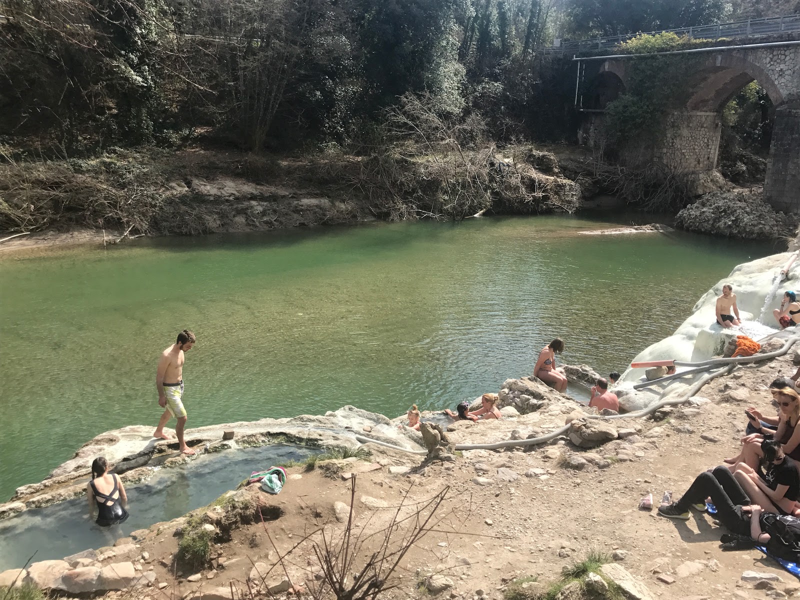 Wir beugen uns dem Teenagerwunsch und fahren baden. Wenn schon, denn schon – die Toskana bietet eine Vielzahl von heißen Quellen. Wir entscheiden uns für die kostenfreien von Petriolo. Als wir parken, lernen wir Willi aus Neuss kennen. Angeblich der Bürgermeister vor Ort hier . Er ist gerade dabei sich abzutrocknen und erklärt uns, dass diese Quellen für die Bevölkerung weiterhin so frei zugänglich bleiben sollen. Er sammelt dafür Unterschriften. Gleich daneben verkauft ein netter Italiener mit Hund Max, Orangen und Honig.
