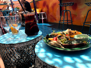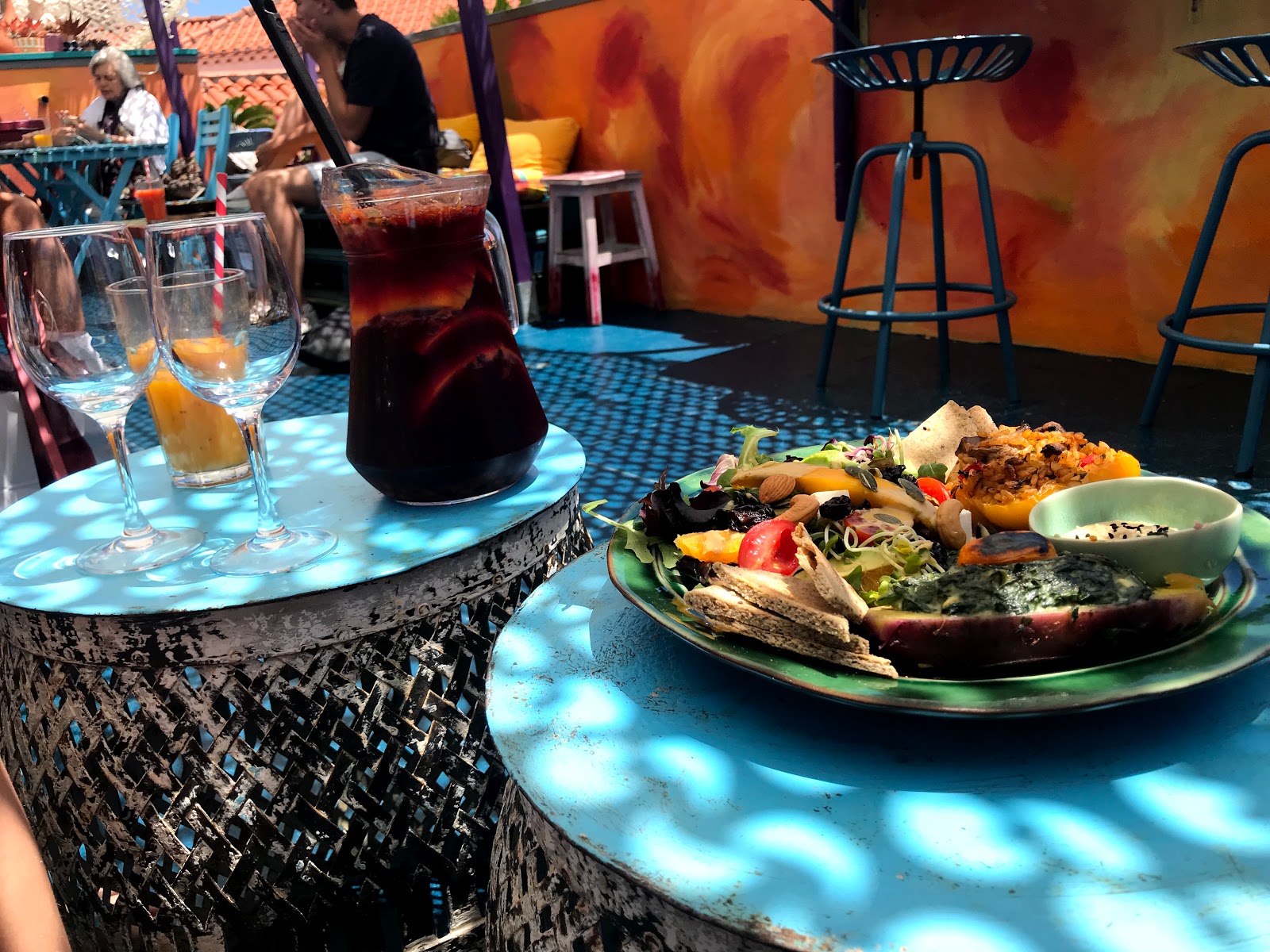 Auf drei Ebenen gibt es hier leckeres veganes Essen, frisch gepresste Säfte und verführerische Kuchen. Obwohl wir gar keinen Hunger haben, erfasst uns dieses cosy Ambiente des Rooftops. Der Sangria hält, was er verspricht – unsere Vegane Platte putzen wir auch weg, als gäbs sonst nix.