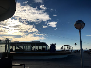 Wir genießen die Ruhe und machen Sport, um ansatzweise unsere Figur halten zu können bei den Leckereien, die hier von überall locken. Der Komiker sagte Gesten in der Show:”Es gibt 9 Stationen und Restaurants, wo man Essen erhalten kann, aber nur ein Fitnessstudio. Wie kann das sein?”